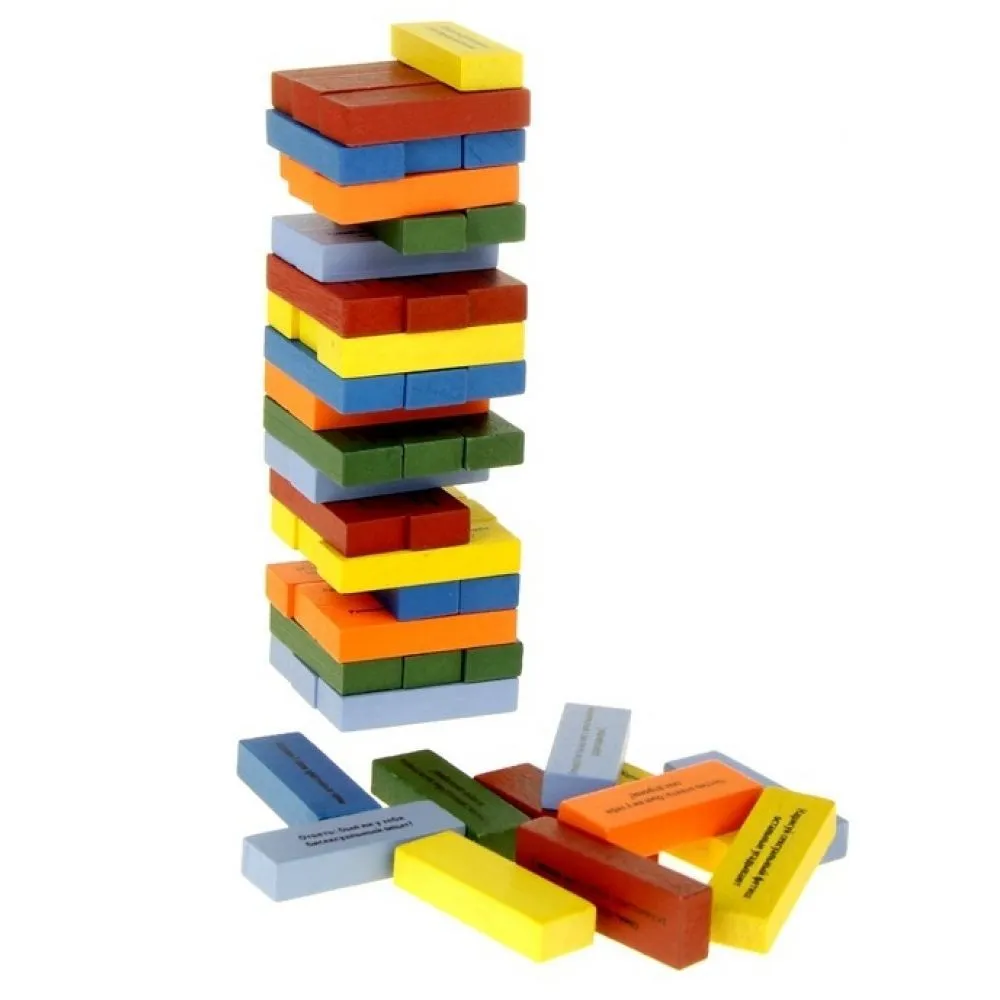 Это новая версия известной во всем мире игры «Падающая башня», или «Пьяная башня». Принцип игры «Башня страсти» прост. Для начала нужно построить из деревянных брусков небольшую башню, сложив их друг на друга. Затем игроки поочередно тянут из башни по одному бруску. Задача каждого игрока – вытянуть брусок так, чтобы башня не сломалась. На каждом бруске написано пикантное задание, которое предстоит выполнить тому, кто его вытянул.