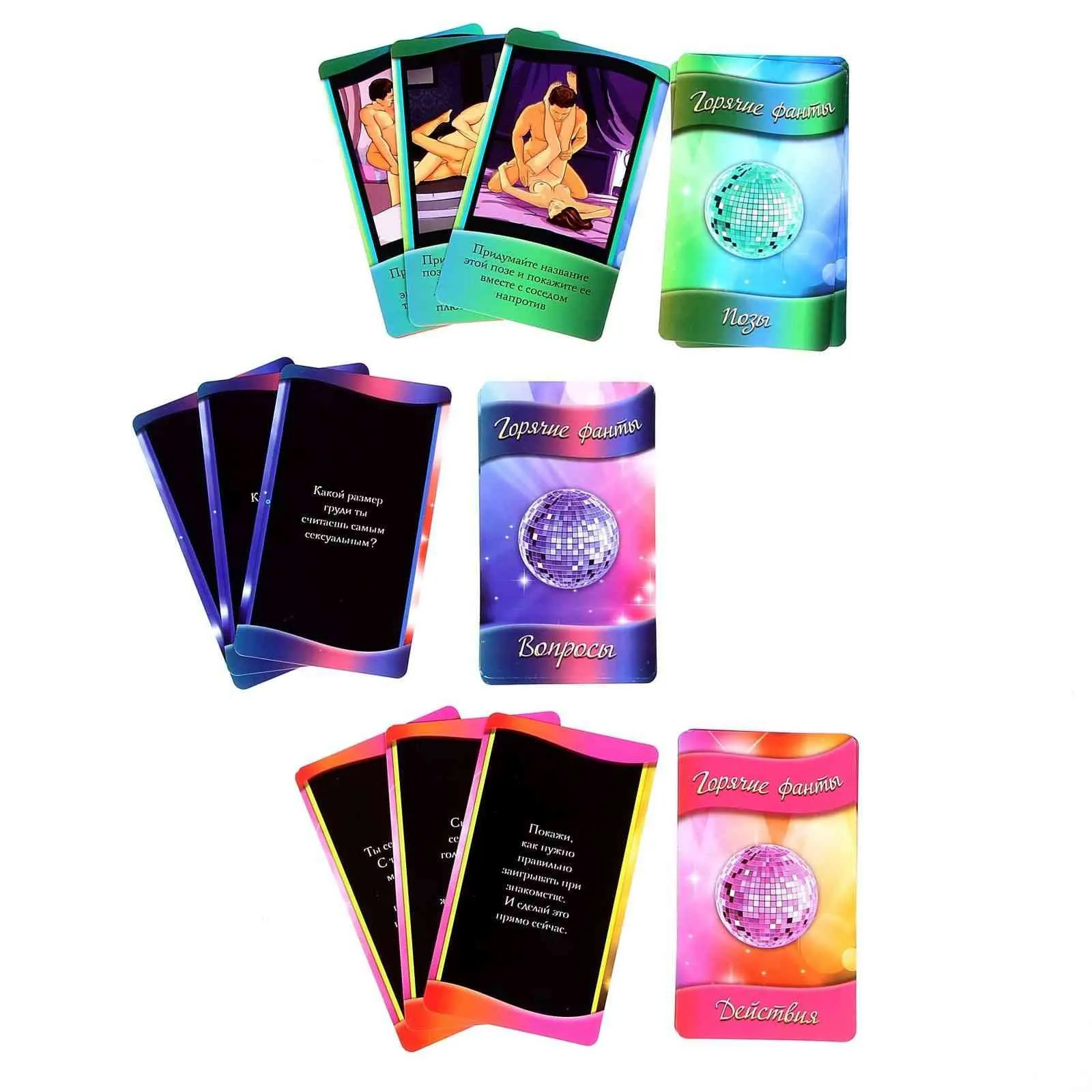 • В набор входит: 20 карт «Вопросы»; 10 карт «Позы»; 10 карт «Действия»; правила игры.