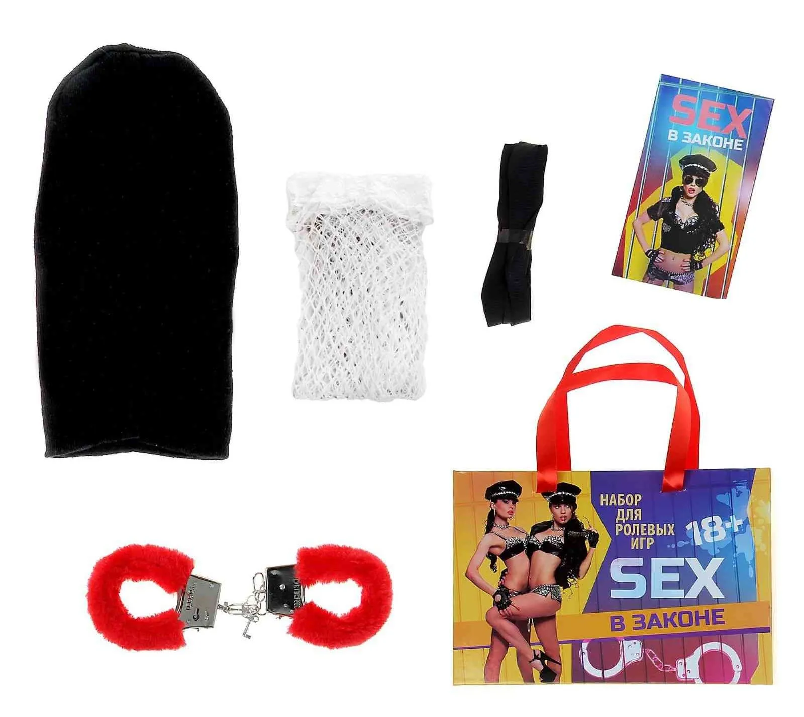 В наборе: наручники, маска преступника, веревка для связывания, чулки, сценарии ролевых игр.