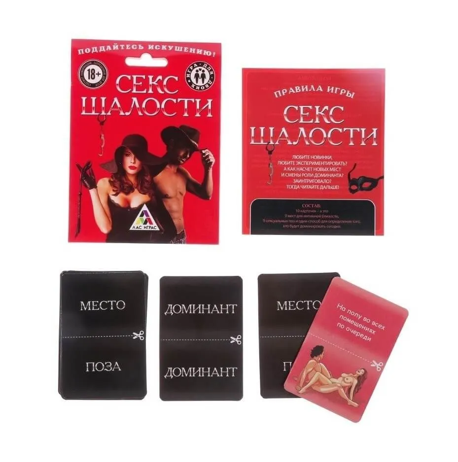 Игра для двоих "Секс шалости" поможет обоим партнерам раскрепоститься и познать новые удовольствия. Сначала определяется, кто из партнеров сегодня будет доминантом, а затем из колоды наугад выбирается карта с местом, где Вы будете заниматься любовью. Смена ролей откроет для Вас новые грани удовольствия и преподнесет много сюрпризов. А пробуя заниматься сексом в различных местах в своей квартире, Вы сможете значительно разнообразить свои интимные игры. Поддайтесь искушению и пошалите вволю вместе с любимым!