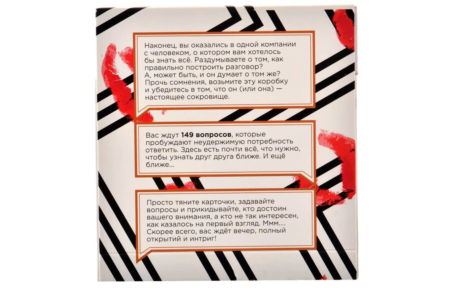 Игра "Конверсейшн. Любовное настроение" состоит из 149 карточек с вопросами для интересной беседы и поможет Вам лучше узнать своего друга или вторую половинку. Вам попадутся как простые вопросы, так и более сложные, ответ на которые нужно будет обдумать и задуматься об отношении к семье, детям, любви или деньгам. Поочередно вытягивая карточки и слушая ответы, Вы сможете