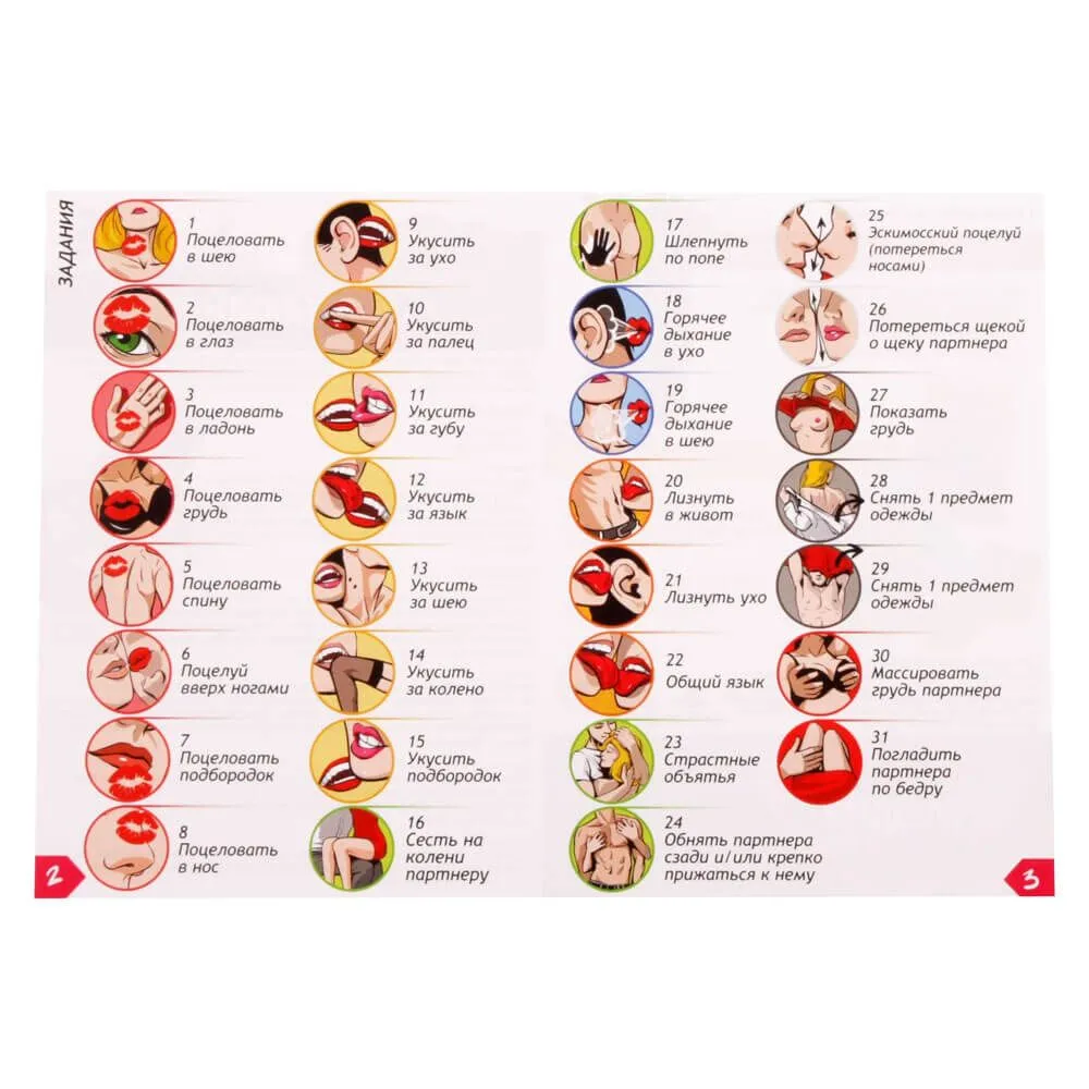 Эротическая игра "Горячая прелюдия страсти", верная своему названию, позволит партнерам достичь наивысшего уровня возбуждения. В процессе игры вы будете выполнять как чувственные и нежные задания, так и наиболее откровенные. Насладитесь жаркими поцелуями, укусами, прикосновениями и дыханием друг друга, от которых голова пойдет кругом от желания! Игра состоит из 30 круглых карт, на каждой из которых есть 6 разных рисунков. На любых двух картах один рисунок всегда совпадает.