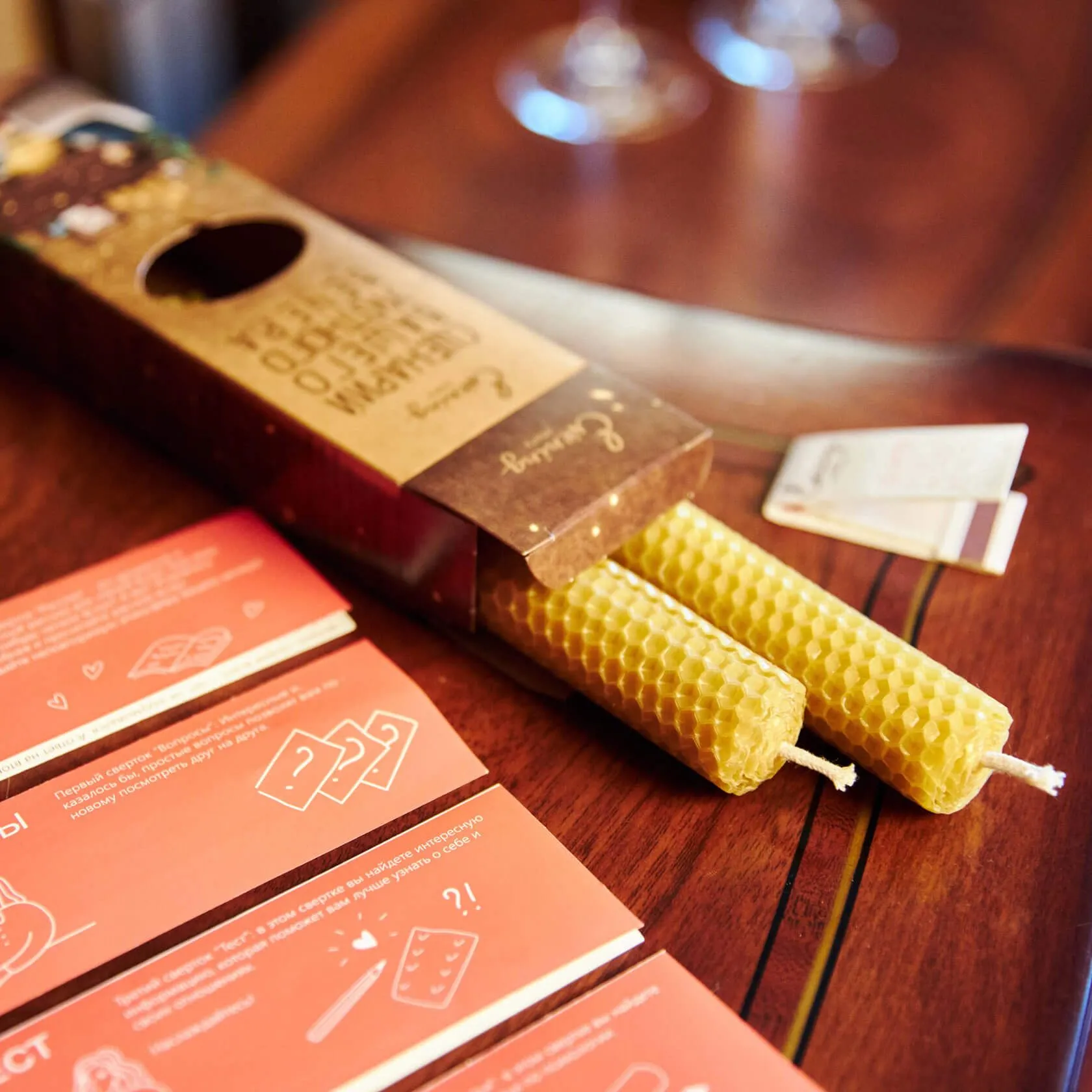 • Свечи ручной работы из натурального воска, для создания атмосферы. Длина каждой свечи 20,5 см, время горения около 3 часов