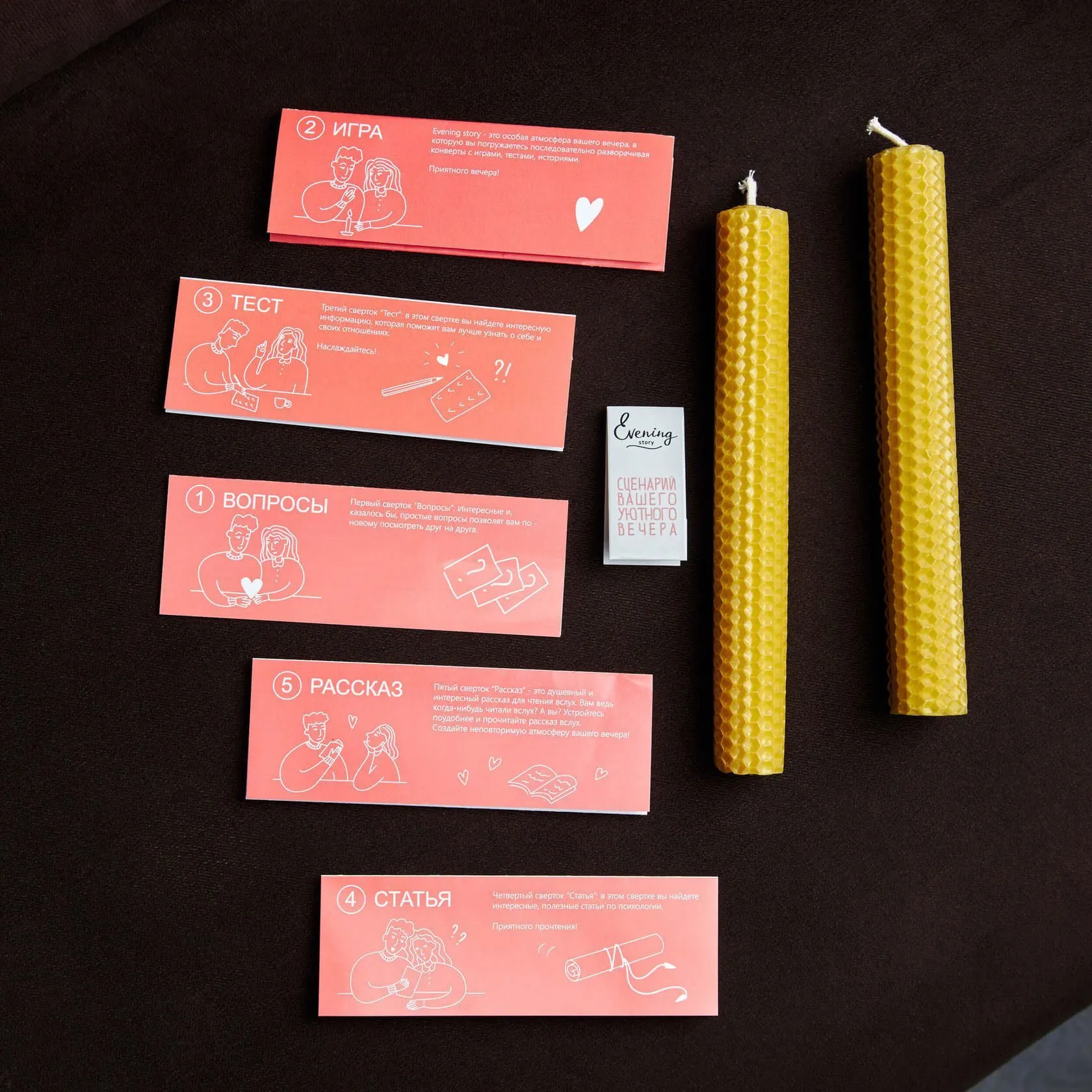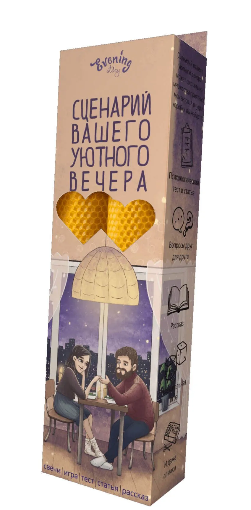 Набор "Сценарий вашего уютного вечера" от Evening Story это легкий способ для пары провести уникальное и запоминающееся свидание. Данный сценарий, за 2 часа, поможет вам сблизится и лучше узнать друг друга. А так же найти в партнёре что-то новое, даже если вам кажется, что вы уже знаете абсолютно всё.