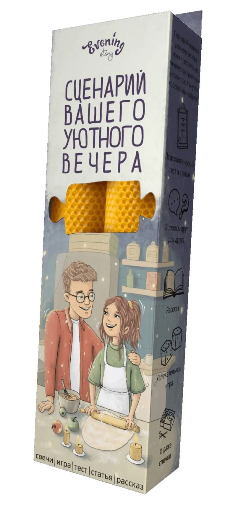 Набор "Сценарий вашего уютного вечера" от Evening Story это легкий способ для пары провести уникальное и запоминающееся свидание. Данный сценарий, за 2 часа, поможет вам сблизится и лучше узнать друг друга. А так же найти в партнёре что-то новое, даже если вам кажется, что вы уже знаете абсолютно всё.