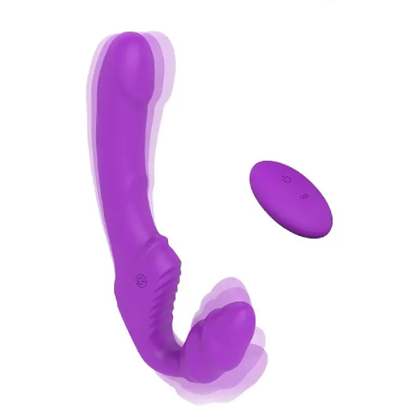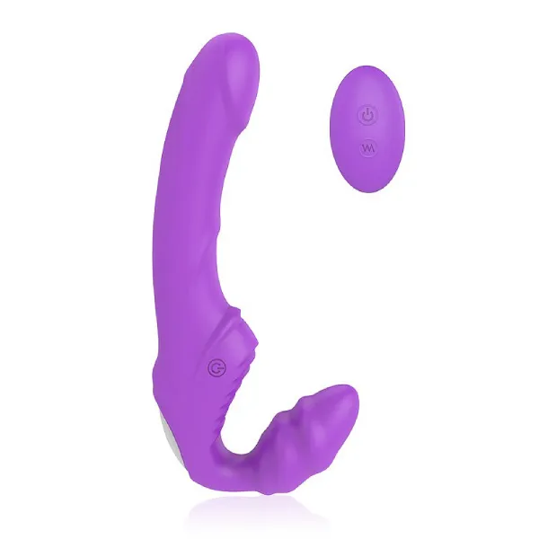 Яркий безремневой страпон для тех, кто хочет получать двойное удовольствие. Один отросток в виде рельефной шишечки женщина вставляет в своё влагалище, другой длинный имитирующий половой член вводит в того, кого она хочет удовлетворить. У девайса него приятная поверхность из безопасного силикона и целых 9 режимов вибрации, которые можно менять при помощи пульта дистанционного управления.