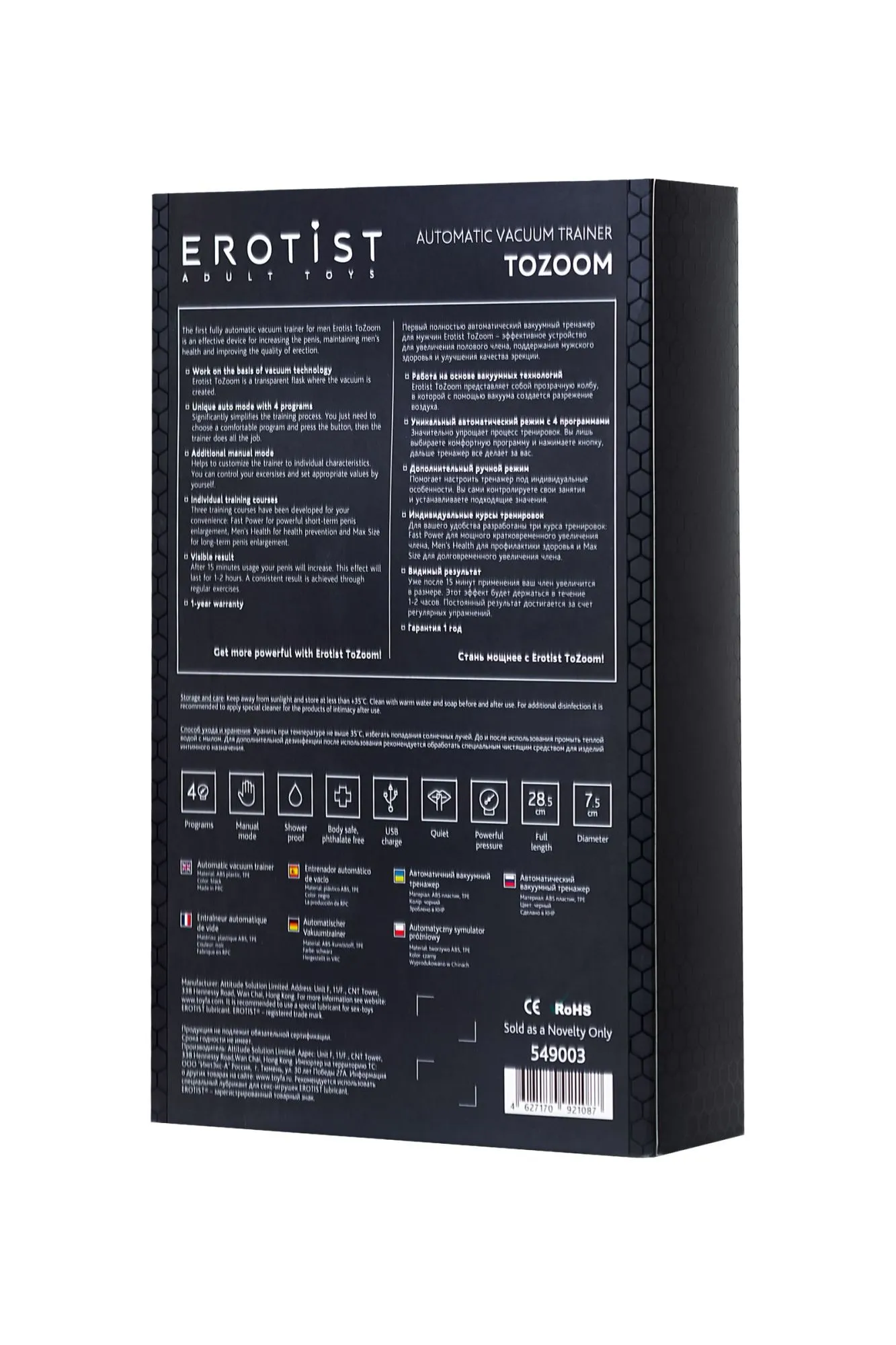 Первый полностью автоматический вакуумный тренажер для мужчин Erotist ToZoom — эффективное устройство для увеличения полового члена, поддержания мужского здоровья и улучшения качества эрекции. Работа на основе вакуумных технологий. Erotist ToZoom представляет собой прозрачную колбу, в которой с помощью вакуума создается разрежение воздуха. Для корректной работы устройства необходимо плотно прижать помпу к телу для создания полного вакуума. В случае попадания воздуха в колбу в процессе работы сработает предохранитель и произойдет выключение устройства. Уникальный автоматический режим с 4 программами. Значительно упрощает процесс тренировок. Вы лишь выбираете комфортную программу и нажимаете кнопку, дальше тренажер все делает за вас. Дополнительный ручной режим. Помогает настроить тренажер под индивидуальные особенности. Вы сами контролируете свои занятия и устанавливаете подходящие значения. Индивидуальные курсы тренировок. Для вашего удобства разработаны три курса тренировок: Fast Power для мощного кратковременного увеличения члена, Men's Health для профилактики здоровья и Max Size для долговременного увеличения члена. Видимый результат. Уже после 15 минут применения ваш член увеличится в размере. Этот эффект будет держаться в течение 1-2 часов. Постоянный результат достигается за счет регулярных упражнений. Гарантия 1 год. Стань мощнее с Erotist ToZoom!