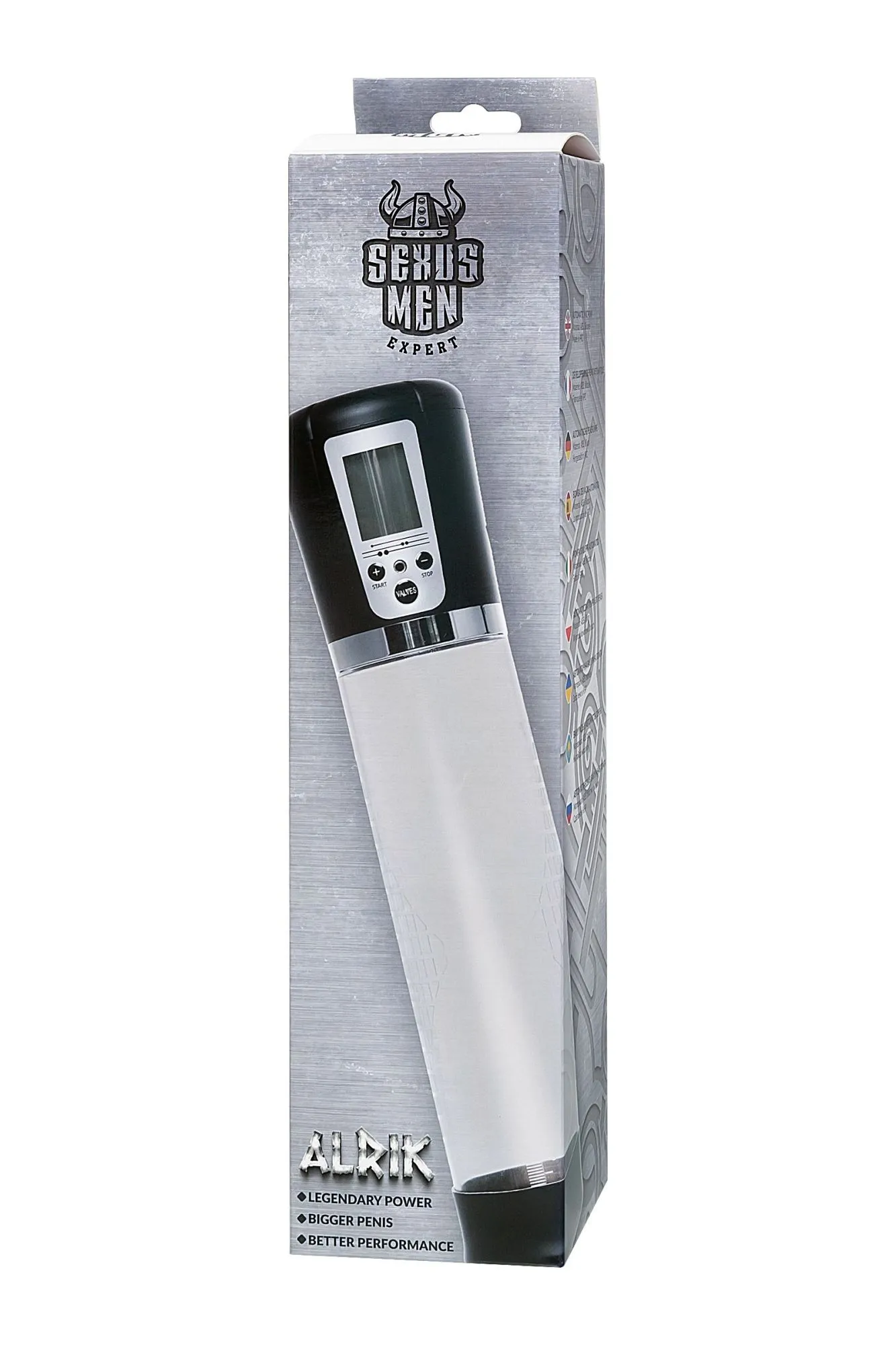 Автоматическая помпа на аккумуляторе Alrik от Sexus® Men – для самых требовательных мужчин, которые стремятся к легендарной мужской силе. Сексуальное могущество для мужчины – не только крепкая и надежная эрекция, но и внушительный размер орудия. С автоматической помпой Alrik серии Sexus® Men Expert возможно достичь впечатляющих результатов в области увеличения размеров пениса, занимаясь пенбилдингом по эффективной программе тренировок. Для тренировки, а также чтобы подготовить себя к длительному и яркому сексу, вставьте свой пенис в колбу и откачайте воздух. С помпой Alrik не нужно прилагать усилий для создания вакуума, она сделает это за вас комфортно и безопасно. Помпа имеет 4 уровня давления, которые регулируются кнопками +/ - на колбе, сброс давления – кнопкой Valves. На LCD экране помпы Alrik можно видеть время помпирования, давление и уровень, на котором в данный момент работает умное устройство. После сброса давления помпа сама откачает воздух до заданного режима. Благодаря отрицательному давлению увеличивается приток крови к половому члену. Прозрачный ABS-пластик позволяет наблюдать как пенис набирает силу и увеличивается в размере. А измерительная шкала помогает отслеживать результаты прямо в процессе. Для достижения ощутимых результатов рекомендуются систематические занятия по программе эффективного тренинга, которая входит в комплект. Регулярное использование вакуумной помпы Alrik от Sexus® Men позволяет: последовательно увеличить длину и диаметр полового члена, делая его более внушительным и прокаченным сделать эрекцию более стабильной, крепкой и продолжительной повысить сексуальную выносливость и половое влечение поднять уверенность в своих возможностях и совершать новые сексуальные подвиги понизить вероятность образований аномальных фиброзных тканей Помпа Alrik комплектуется программой тренировок и USB-проводом для зарядки. Порядок работы помпы: Включение: коротким нажатием на кнопку «+» помпа включается на нулевом уровне, загорается LCD экран. Повышение уровней: коротким нажатием на кнопку «+» последовательно повышайте уровни откачки воздуха. На экране в режиме реального времени отображается давление в колбе в Mbar. Помпа останавливается на заданном уровне и поддерживает указанный индикатором уровень давления. Если вы сбросите давление кнопкой «VALVES», помпа автоматически откачает воздух до заданного уровня. Понижение уровней: сбросьте давление кнопкой «VALVES», а затем коротким нажатием на кнопку «-» последовательно понижайте уровни давления в помпе. На экране в режиме реального времени отображается давление в колбе в Mbar. Помпа останавливается на заданном уровне и поддерживает указанный индикатором уровень давления. Сброс давления: кнопкой «VALVES» помпа сбрасывает давление в колбе. Если вы не понизили уровень, то помпа автоматически восстановит его до указанного красным индикатором. Выключение: последовательно понижайте уровни кнопкой «-» следующее нажатие после уровня 0 Kpa выключит помпу. Перед тем, как извлечь член из помпы, сбросьте давление кнопкой «VALVES». LCD экран показывает уровень заряда аккумулятора, режим давления, текущее давление в Mbar, время тренировки.