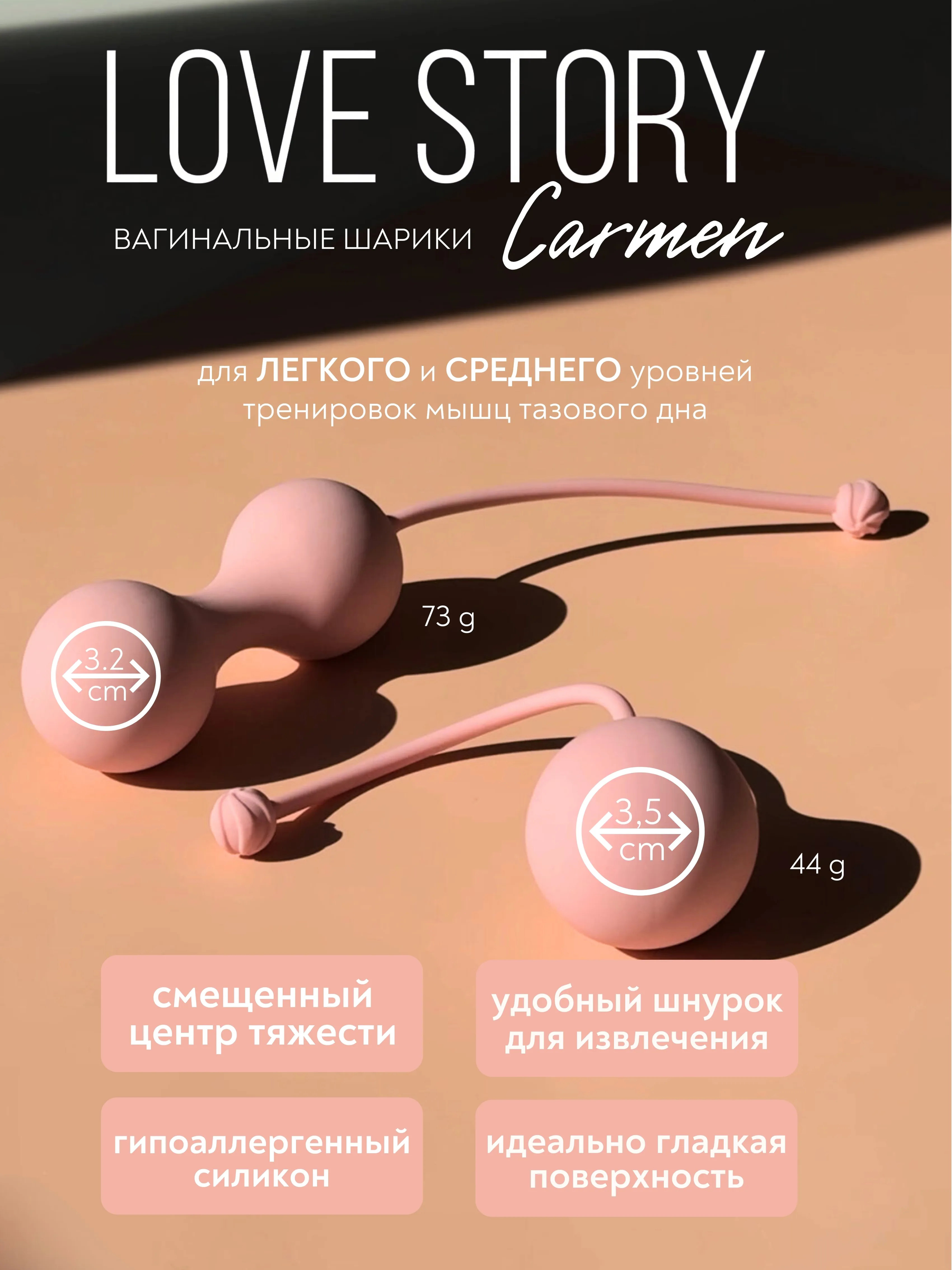 Набор вагинальных шариков со смещенным центром тяжести Carmen для для легкого и среднего уровня тренировок мышц тазового дна предназначен для укрепления интимных мышц и повышения их чувствительности. В комплект входят двойные шарики на сцепке весом 73 г и одинарный весом 44 г. Тренировки можно начать с более легкого шарика, постепенно увеличивая нагрузку. Вагинальные шарики можно использовать для спокойных тренировок по системе Кегеля, или в дополнении к занятиям спортом. Для комфортного использования рекомендуется добавить лубрикант. Материал: гипоаллергенный силикон. Максимальная длина шариков на сцепке —18,3 см, максимальный диаметр — 3,2 см. Максимальная длина одинарного шарика — 13,9 см, максимальный диаметр — 3,5 см.