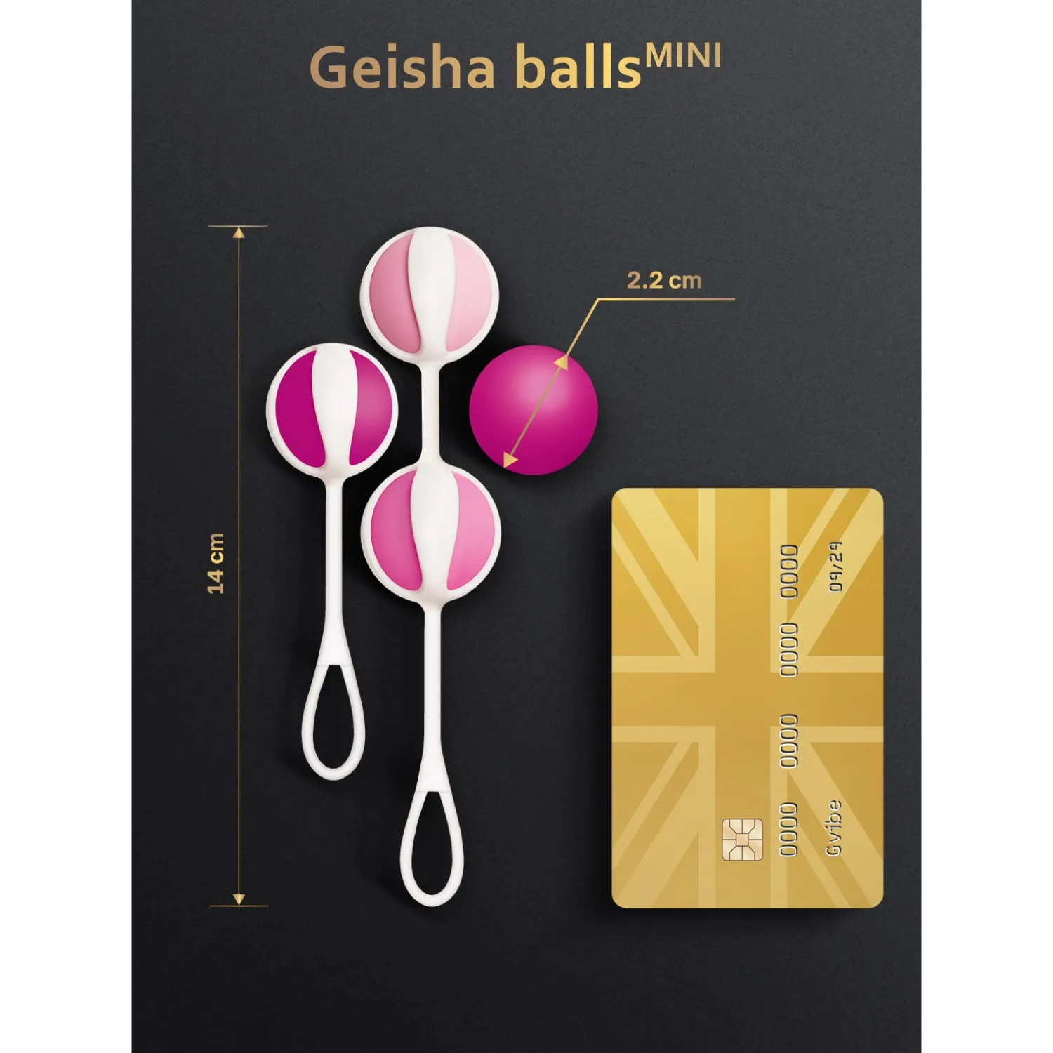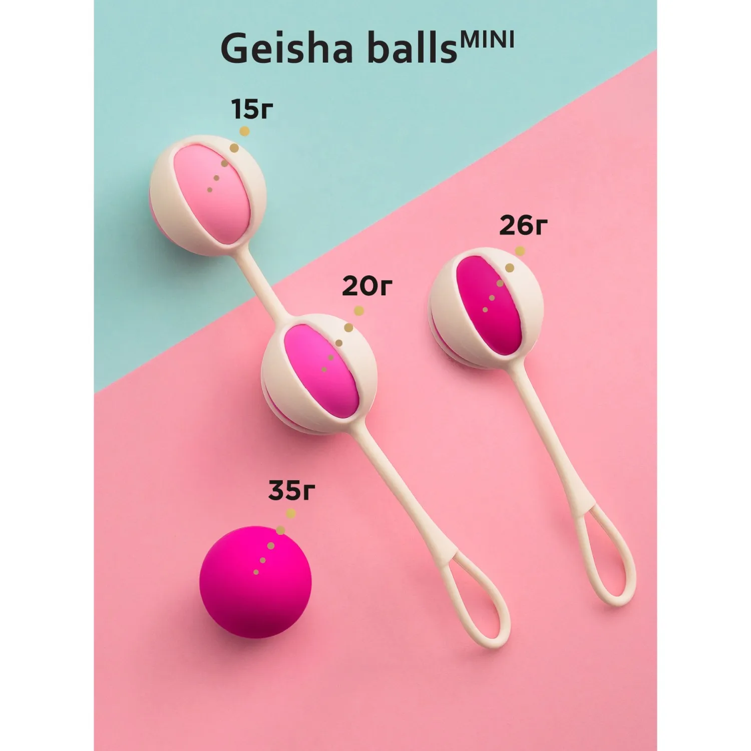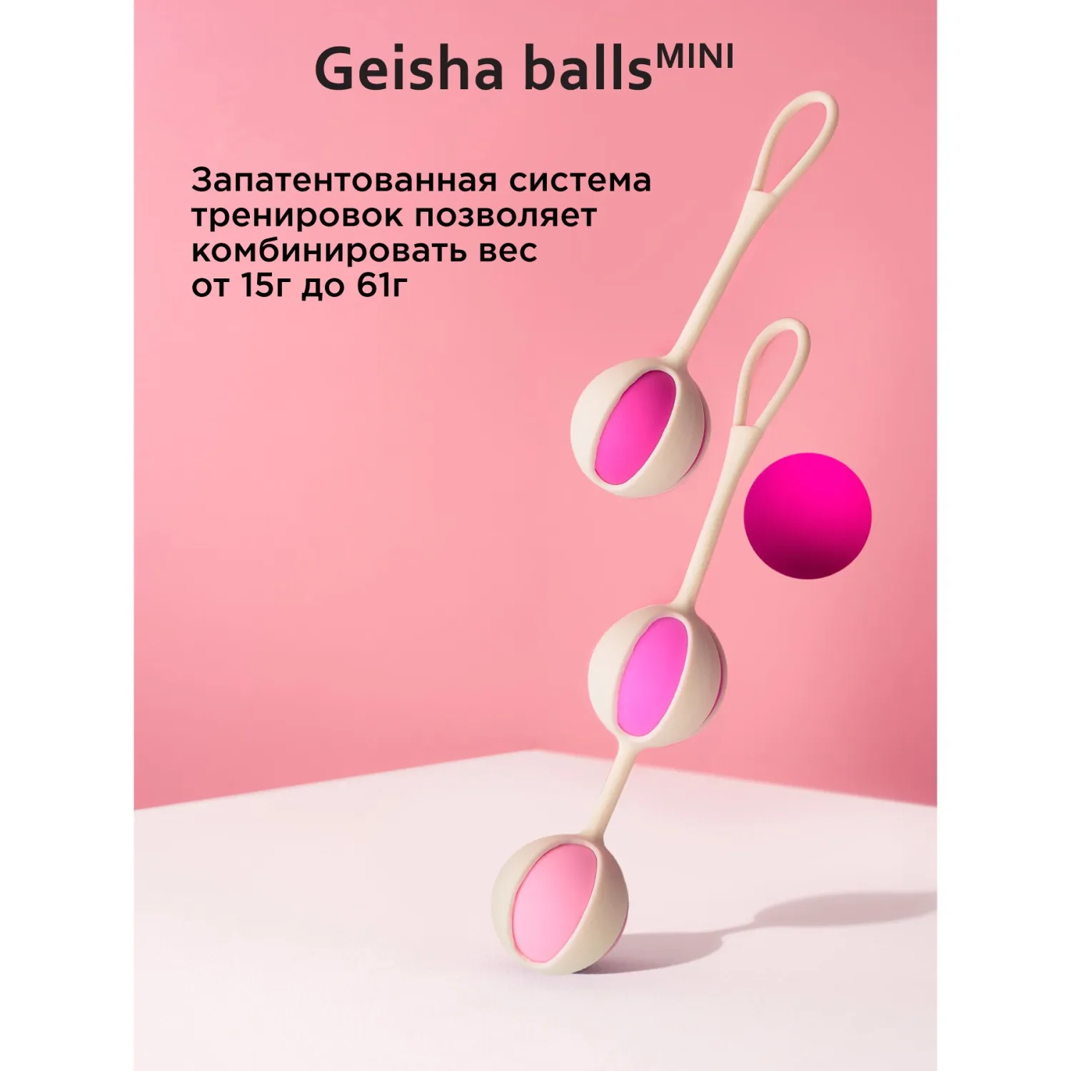 Наш стартовый набор Gvibe Geisha Balls Mini содержит 4 шарика разного веса – от 15г до 35г, а также два силиконовых ремешка – для одного шарика и для двух. Малый вес и уменьшенный диаметр шариков идеально подходят для начинающих.