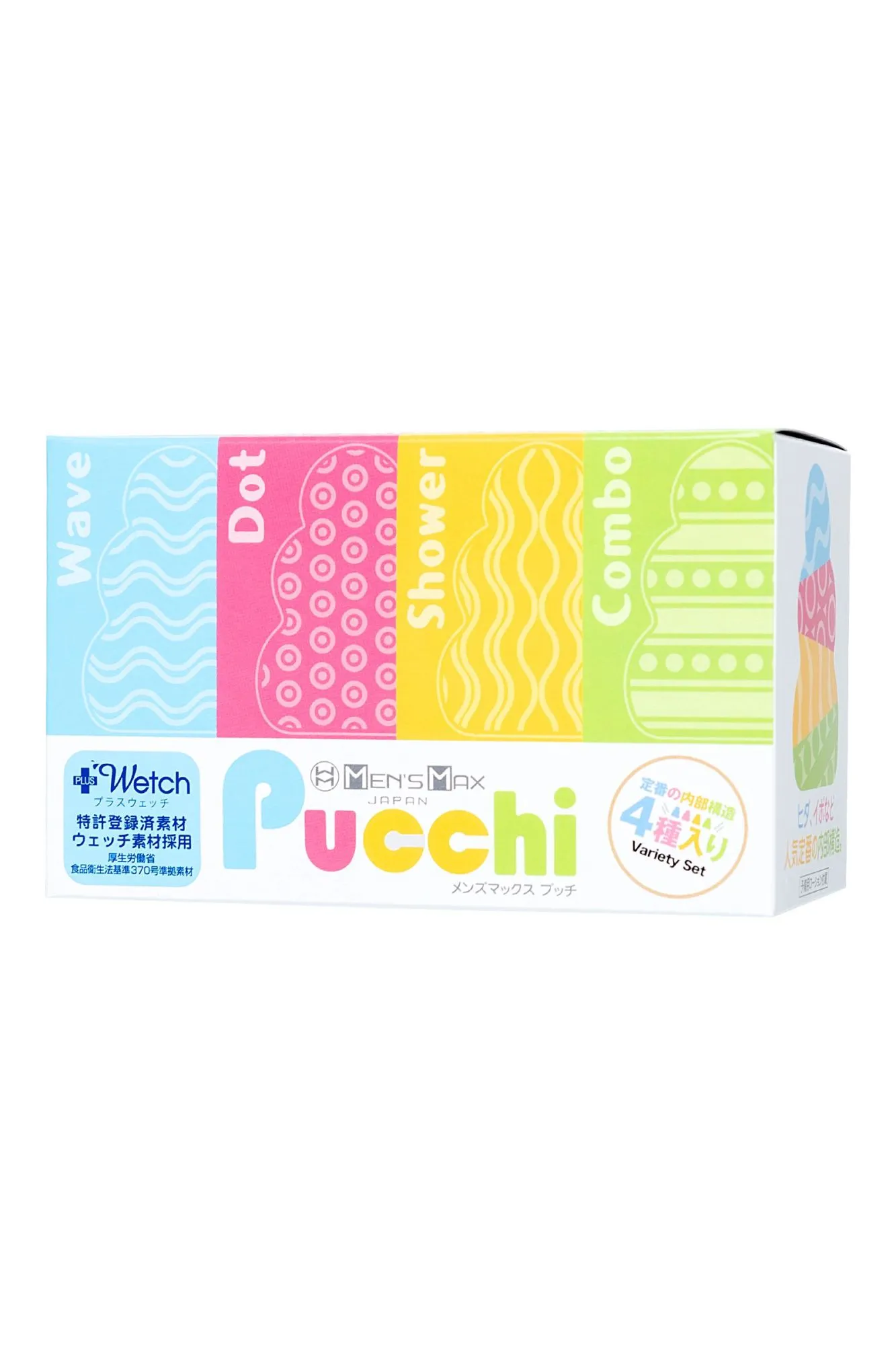 Обновленные карманные мастурбаторы MensMax Pucchi Set Box Variety в одном наборе. Эти разнообразные секс-игрушки имеют увеличенный размер, улучшенную эластичность, более четкий рельеф, и выделяют еще больше смазки – берите мастурбатор с собой куда угодно. Все что вам нужно – это MensMax Pucchi и немного воды. Самоувлажняющийся мастурбатор невероятно удобен в командировках, путешествиях и в повседневной жизни. Благодаря запатентованной японской технологии, инновационный материал +Wetch при взаимодействии с водой выделяет густой гель, усиливающий скольжение. Даже во время длительного массажа пениса гель не скатывается и не высыхает. Достаточно добавить немного воды, чтобы испытать полный спектр эмоций от интимного удовольствия. Многоразовая непрозрачная упаковка с замочком-клапаном служит мешочком для хранения. Упругий, но эластичный материал подходит для мужчин с любыми размерами пениса. Материал игрушки тактильно приятный и быстро принимает температуру тела. Чтобы усилить ощущения, добавьте теплую воду и наслаждайтесь температурными играми. MensMax Pucchi производят на новейшем оборудовании в Японии, что гарантирует качество и безопасность использования. В наборе 4 мастурбатора Pucchi с разнообразными рельефами: Wave, Dots, Shower и Combo. Каждая игрушка представляет собой мягкую трехъярусную елочку с одним отверстием. Внешняя сторона гладкая и нежная, а внутри разнообразные комбинированные рельефы, которые обеспечивают дополнительный массаж пениса, и особенно ярко ощущаются при стимуляции головки. Чем глубже проникновение, тем ощутимее стимуляция. Когда под рукой целый набор мастурбаторов – легко подобрать нужный рельеф под настроение, или использовать несколько игрушек одновременно. Инструкция: Достаньте мастурбатор из упаковки и налейте в него немного воды (чайную ложку). Старайтесь не намочить внешнюю сторону игрушки, чтобы смазка не мешала вам в процессе. Распределите образовавшийся гель по внутренней поверхности девайса. Начните с массажа головки, так вы сможете получить максимальное наслаждение от рельефа и настроиться на нужный лад. Совершайте вращательные движения по часовой стрелке или против нее. Для предварительных ласк партнерши выверните мастурбатор наизнанку и наденьте на пальцы. После игр промойте Pucchi водой или средством для очистки игрушек. Когда израсходуете смазку мастурбатора, выбирайте лубриканты на водной основе.