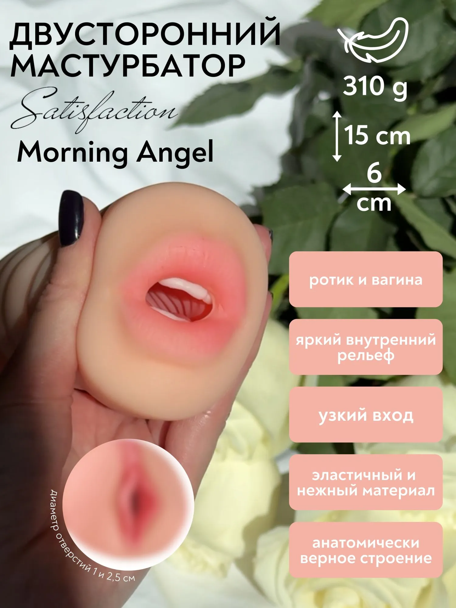 Двойной мастурбатор эластичной текстуры, способен возбудить и довести до оргазма любого мужчину. Перед использованием рекомендуется добавить лубрикант. Он выполнен в виде двух любовных отверстий: вагины с мурашками на коже и женского ротика (раскрашенного вручную) с белоснежными зубками, подвижным язычком и гландами. Рельефная внутренняя текстура которой напоминает анатомическое строение девушки, и для создания которой применяется двойная заливка материала. Инновационная технология "Узкий Вход" обеспечит максимально плотный обхват и создаст ощущение сжатия вагинальными мышцами. Мастурбатор выполнен из TPR, безопасен для кожи, не содержит фталатов. Подойдет для любого размера. Общая длина – 15 см, ширина – 6 см, высота — 6,3 см, диаметр отверстия – 1 и 2,5 см.