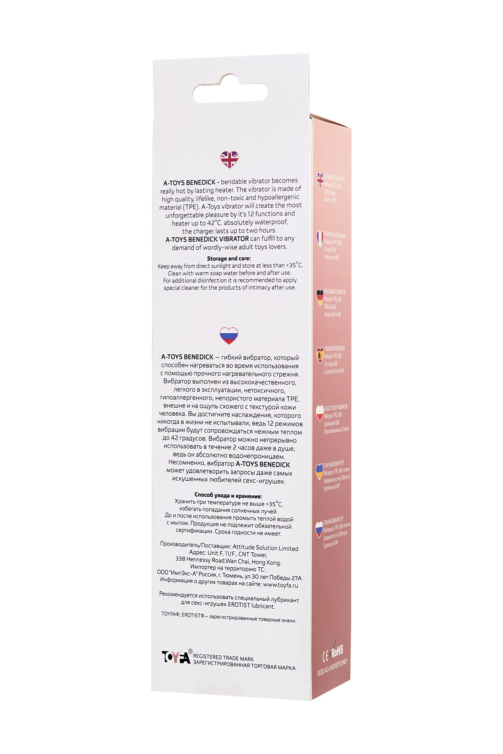 A-Toys Benedick — гибкий вибратор, который способен нагреваться во время использования с помощью прочного нагревательного нагревательного элемента, расположенного в головке игрушки. Вибратор выполнен из высококачественного, легкого в эксплуатации, нетоксичного, гипоаллергенного, непористого материала TPE, внешне и на ощупь схожего с текстурой кожи человека. Вы достигните наслаждения, которого никогда в жизни не испытывали, ведь 12 режимов вибрации будут сопровождаться нежным теплом до 42 градусов. Вибратор можно непрерывно использовать в течение 2 часов. Несомненно, вибратор A-Toys Hot может удовлетворить запросы даже самых искушенных любителей секс-игрушек. Рабочая длина 19 см.