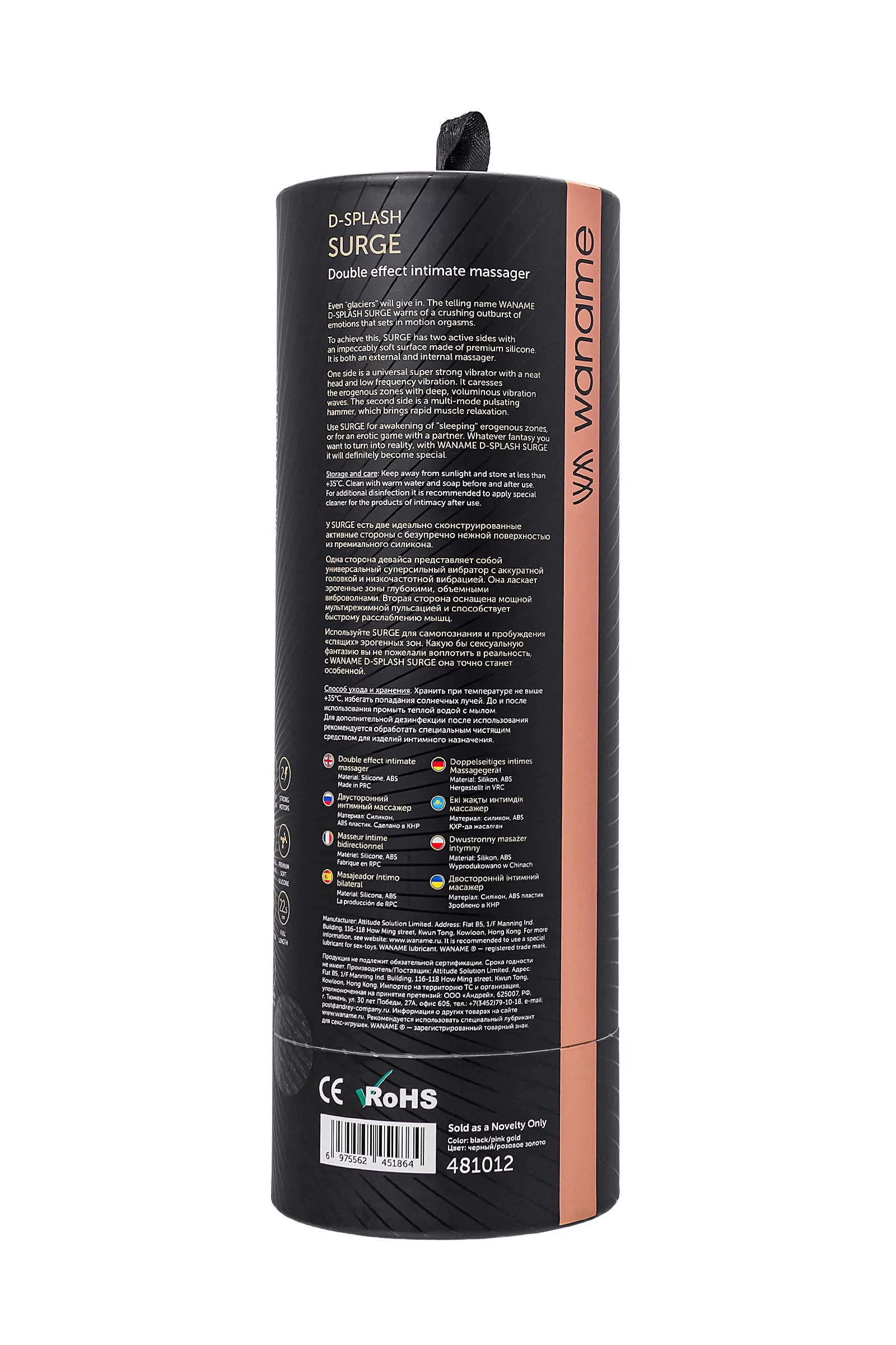 Двусторонний интимный массажер WANAME D-SPLASH Surge, силикон, черный, 22,5 см