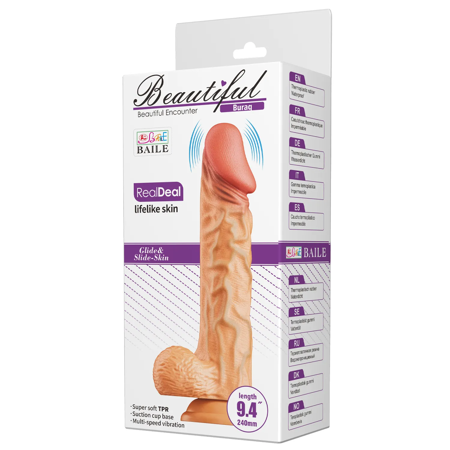 Реалистичный вибрирующий фаллоимитатор с присоской. Длина игрушки составляет 24 см, диаметр — 5 см, а длина рабочей части — 18 см. Выполнен из материалов TPR и ABS с двойной плотностью: мягкий внешний слой и твёрдый внутренний для более реалистичных ощущений. Вибрация управляется проводным пультом, а питание осуществляется от 2 батареек типа AA. Прочная присоска надёжно крепится к гладким поверхностям, обеспечивая свободу движений и различные варианты использования. Весит 436 грамм.