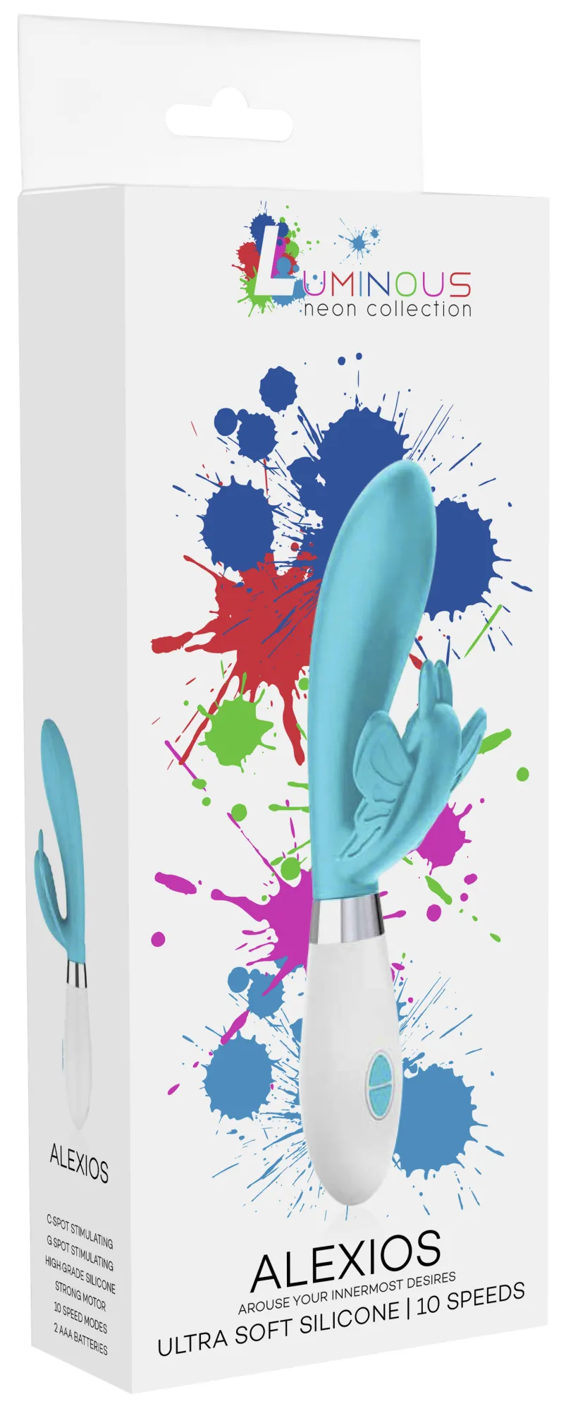 Alexios – вибромассажер кролик. Эта игрушка имеет округлую утолщенную головку и гибкий клиторальный отросток, что делает стимуляцию более яркой. Вибромассажер имеет два мощных двигателя, по одному в каждом отростке, имеющих 10 функций вибрации, способной достигать на вагинальном стволе 15000 и на клиторальном отростке 5200 оборотов в минуту, при этом уровень звука не превышает 50 дБ.