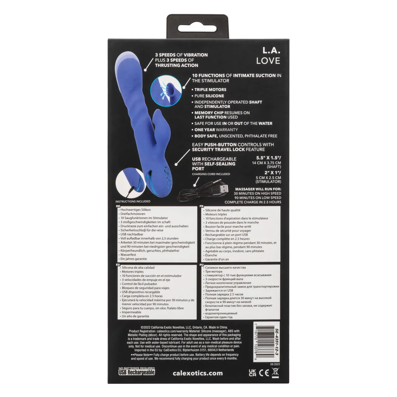 California Dreaming L.A. Love – перезаряжаемый мульти скоростной вибратор кролик из бесшовного материала с дополнительной обработкой. Вагинальный отросток у этой модели имеет 3 функции «интенсивное поступательное воздействие». Клиторальный отросток имеет отдельный мощный виброэлемент, обеспечивающий 10 режимов интенсивного всасывания.