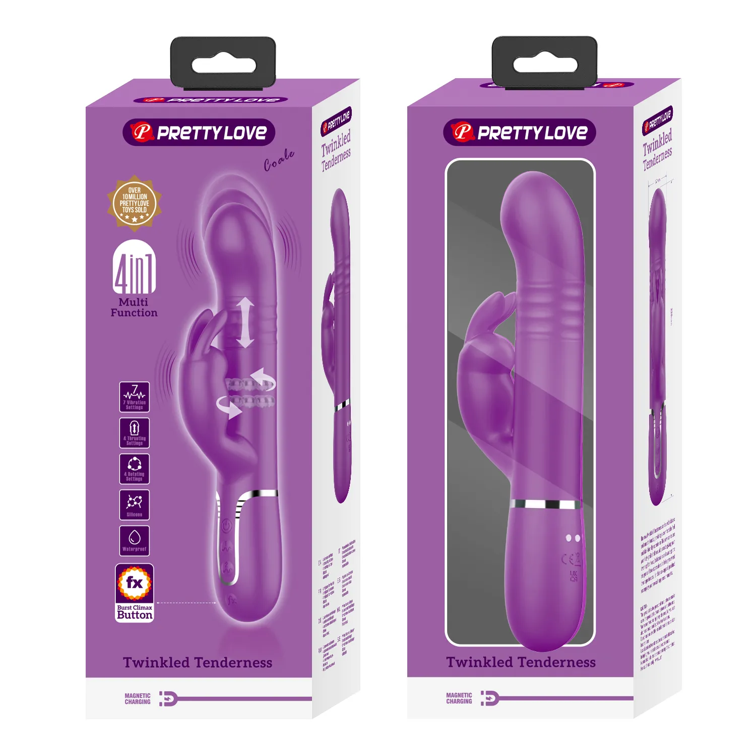 Вибратор Twinkled Tenderness Coale от бренда PRETTY LOVE предназначен для вагинальной и клиторной стимуляции. Изготовлен из безопасных для тела материалов — силикона и ABS. Вибратор оснащен двумя моторами: один расположен в наконечнике, другой — в наружном отростке. Устройство предлагает 7 режимов вибрации, 4 функции вращения и 4 режима толчков. Однорядные жесткие шарики внутри ствола обеспечивают дополнительную стимуляцию. Питается от магнитной USB зарядки, что обеспечивает удобство использования. Размеры вибратора: длина 226 мм, диаметр 37 мм, длина рабочей части 125 мм. Вес устройства составляет 255 граммов.