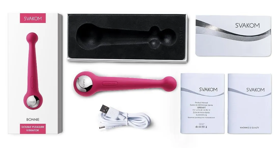 Необычная форма вибромассажера Bonnie от компании Svakom с двумя головками и множество вариантов работы позволят Вам поэкспериментировать с позами, а также со своими ощущениями при массаже и стимуляции различных эрогенных зон.