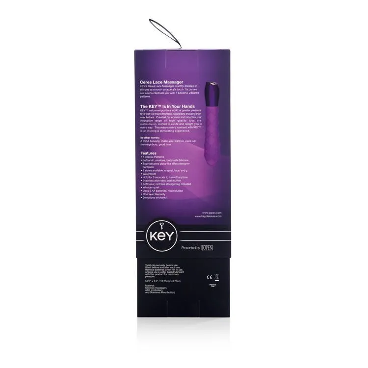Key Ceres Lace сделан из качественного силикона и очень приятен на ощупь благодаря своей бархатистой текстуре. Он не обладает запахом и полностью гипоаллергенен. Работает от двух батареек типа АА (в комплект не входят).