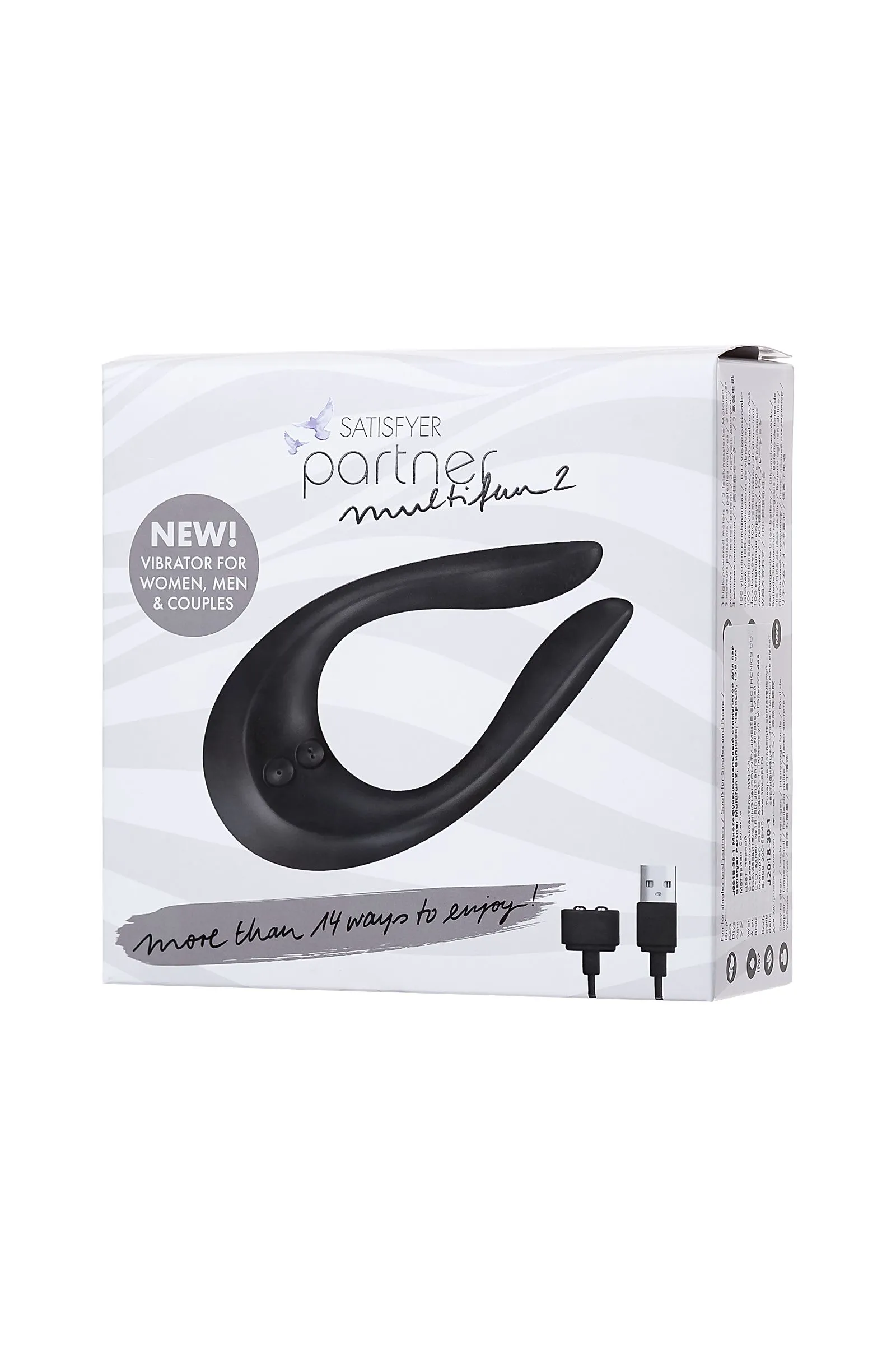 Многофункциональный стимулятор для пар Satisfyer Partner Multifun 2 придает интимной жизни буйство ощущений — он может заменить сразу 4 секс-игрушки, радует 14-ю вариантами применения и предлагает более ста сногсшибательных комбинаций, которые только и ждут, пока вы откроете их для себя. Неважно, будет ли Multifun 2 сверху, снизу или сбоку — этот соблазнительный умелец искусно встроится во все ваши любовные игры. Он равномерно распределит каждый из десяти режимов вибрации с помощью трех моторов с независимым управлением и с легкостью синхронизируется под ваше удовольствие. Попробуйте! Стимулятор для пар. Во время интимной сессии установите широкую сторону девайса на клитор, а «ушки» направьте на мошонку или член партнера. Волнующий массаж — лучшая прелюдия перед громким оргазмом. Массажер внешних эрогенных зон. Проведите трепещущими кончиками игрушки по шее, груди, соскам, бедрам, клитору, половым губам, мошонке, члену партнера и другим чувствительным местам. Увидите, они ответят на нежные импульсы мгновенным возбуждением. Вибратор для точки G. Пульсирующие «пальчики» Multifun 2 имеют идеальную форму и длину для пробуждения загадочной G-точки. Просто введите их внутрь и отдайтесь наслаждению. Игрушка для экспериментов в душе. Стимулятор обладает полностью водонепроницаемой поверхностью, с ним вы легко сможете взбодрить свой утренний душ или расслабиться в вечерней ванне с ароматной пенкой. Кольцо для члена. Наденьте девайс на член партнера. Массажер порадует плотным обхватом, а вибрация усилит эмоции от стимуляции и приведет к более яркой разрядке. Согласитесь, любовь — это когда всем делятся друг с другом, так почему бы не поделиться оргазмом от Multifun 2?