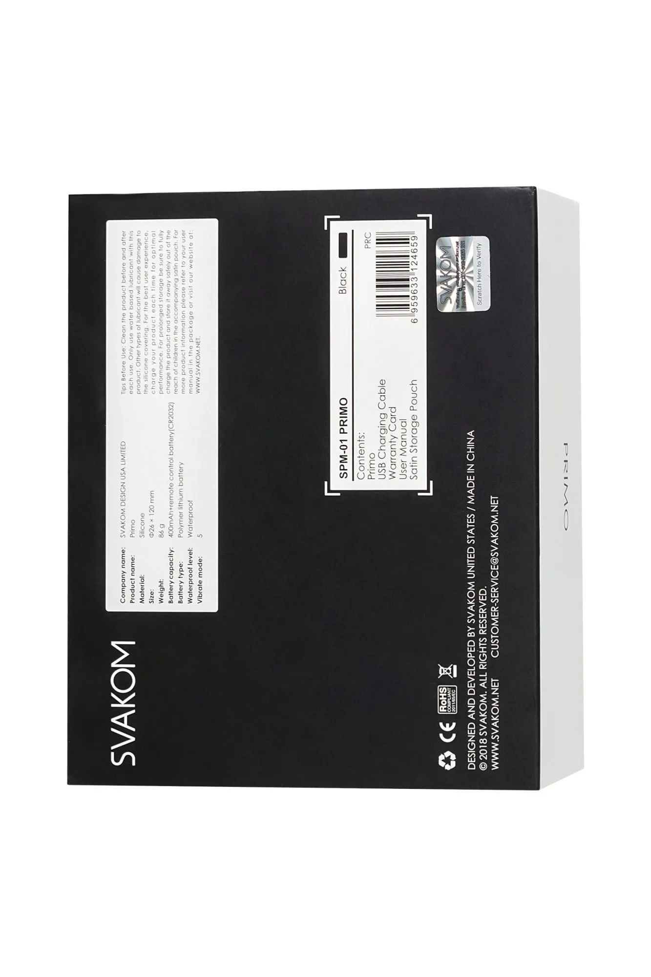 Primo Svakom — это интеллектуальная анальная вибропробка из силикона с нагревом и пультом дистанционного управления. Этот очень тихий, практически бесшумный анальный вибратор можно также использовать и для стимуляции зоны «G», если физиологически подходит. Но основная его функция — анальная стимуляция, для подготовки к анальному сексу либо для целенаправленной анальной стимуляции. Если нужно использовать анальную пробку в процессе вагинального секса для усиления ощущений обоих партнеров, то Svakom Primo прекрасно справится с этой ролью, а нагрев до 38 градусов по Цельсию и пульт ДУ раскрасят использование новыми оттенками удовольствия. Есть у Svakom Primo интересная деталь, он нагревается с того момента, как вы начинаете свою игру, его температура поднимается до 38 градусов по Цельсию и расслабляющее тепло начинает разноситься по вашему телу вместе с вибрацией. Только представьте, насколько возбуждающе приятна такая игра. Primo имеет 5 различных режимов, и 5 интенсивности в каждом режиме, поэтому у вас есть 5 х 5 = 25 вариаций режимов. Сделан из абсолютно безопасного, гипоаллергенного и нежного на ощупь силикона. Заряжается от аккумулятора в течение 2 часов, после чего способен непрерывно работать 1 час. Primo Svakom всегда готов доставить удовольствие. Водонепроницаемый, с ним можно использовать любые лубриканты на водной основе. Характеристики: Длина — 12 см; Диаметр — 2,6 см; Кол-во режимов вибрации — 5; Элементы питания — встроенный аккумулятор; Время зарядки 2 часа, время работы 1 час; Вес — 86 грамм.