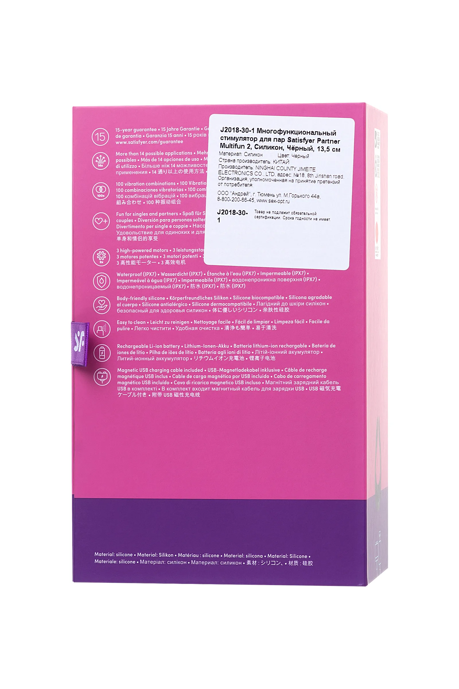 Многофункциональный стимулятор для пар Satisfyer Partner Multifun 2 придает интимной жизни буйство ощущений — он может заменить сразу 4 секс-игрушки, радует 14-ю вариантами применения и предлагает более ста сногсшибательных комбинаций, которые только и ждут, пока вы откроете их для себя. Неважно, будет ли Multifun 2 сверху, снизу или сбоку — этот соблазнительный умелец искусно встроится во все ваши любовные игры. Он равномерно распределит каждый из десяти режимов вибрации с помощью трех моторов с независимым управлением и с легкостью синхронизируется под ваше удовольствие. Попробуйте! Стимулятор для пар. Во время интимной сессии установите широкую сторону девайса на клитор, а «ушки» направьте на мошонку или член партнера. Волнующий массаж — лучшая прелюдия перед громким оргазмом. Массажер внешних эрогенных зон. Проведите трепещущими кончиками игрушки по шее, груди, соскам, бедрам, клитору, половым губам, мошонке, члену партнера и другим чувствительным местам. Увидите, они ответят на нежные импульсы мгновенным возбуждением. Вибратор для точки G. Пульсирующие «пальчики» Multifun 2 имеют идеальную форму и длину для пробуждения загадочной G-точки. Просто введите их внутрь и отдайтесь наслаждению. Игрушка для экспериментов в душе. Стимулятор обладает полностью водонепроницаемой поверхностью, с ним вы легко сможете взбодрить свой утренний душ или расслабиться в вечерней ванне с ароматной пенкой. Кольцо для члена. Наденьте девайс на член партнера. Массажер порадует плотным обхватом, а вибрация усилит эмоции от стимуляции и приведет к более яркой разрядке. Согласитесь, любовь — это когда всем делятся друг с другом, так почему бы не поделиться оргазмом от Multifun 2?