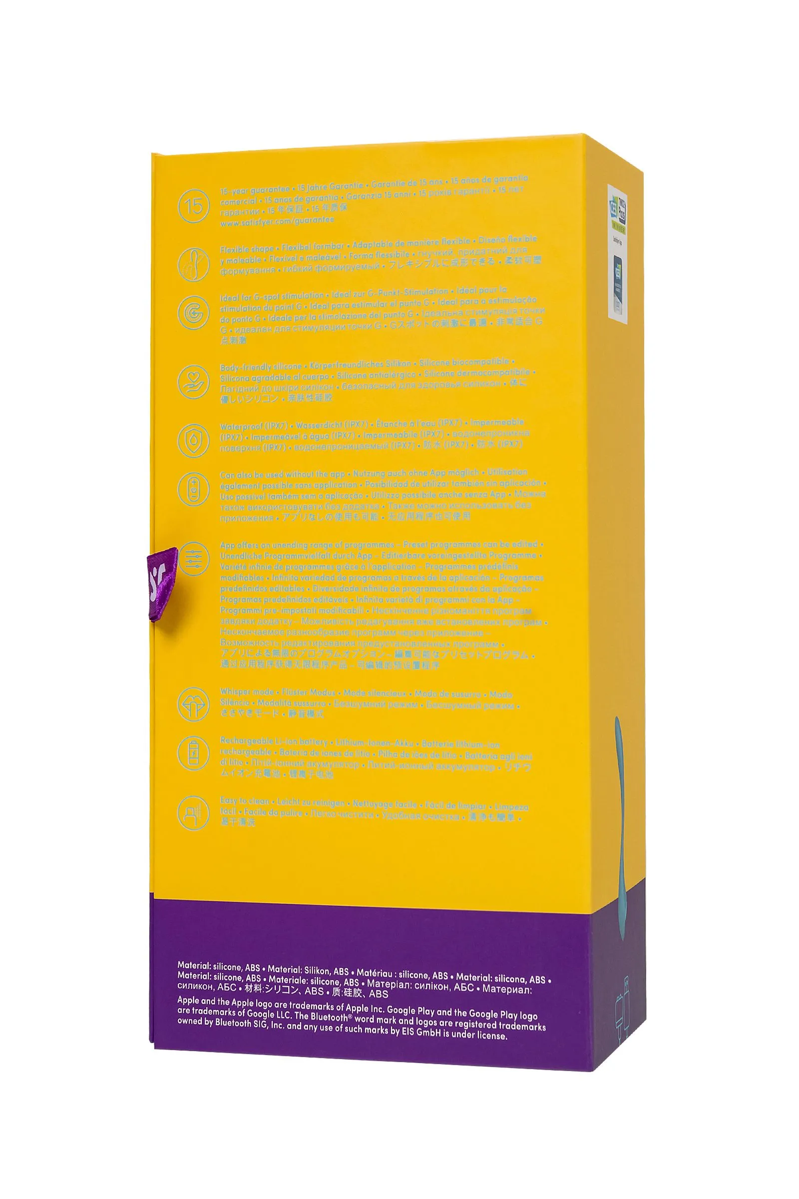 Мультифункциональный и супер гибкий вибратор G-Spot Flex 5 от Satisfyer нацелен на стимуляцию самых чувствительных и потайных эрогенных зон. G-Spot Flex 5 имеет полностью гибкую шейку. Регулируемый угол стимуляции позволяет зафиксировать вибратор так, чтобы зона G получила максимальное соприкосновение с вибрирующим наконечником. G-Spot Flex 5 в сочетании с фантазией проведет вас по пути неземного блаженства в сольной игре или прелюдии с партнером. Элегантный дизайн идеально разработан для воздействия на точку G – для интенсивной стимуляции и комфортного расположения в руке. Деликатное воздействие на все известные и еще неизвестные эрогенные зоны обеспечивает упругая продолговатая форма ствола. Изящный кончик точно ласкает область зоны G и подходит для стимуляции внешних эрогенных зон. Интуитивно понятное управление тремя кнопками прямо на корпусе игрушки, которые ложатся точно под пальчики. Мощный надежный мотор стимулирует наслаждение с помощью 12 предустановленных паттернов вибрации. Испытайте удовольствие по-настоящему с бесплатной функцией управление при помощи смартфона с поддержкой Bluetooth через приложение Satisfyer Connect, доступное на Android и iOS. Создавайте собственные уникальные режимы вибрации, существенно расширив возможности предустановленных режимов. Девайс способен вибрировать даже в такт музыке. Satisfyer Connect не имеет границ – передавайте управление удовольствием партнеру даже на большом расстоянии. Шелковистое силиконовое покрытие — фирменный знак Satisfyer, тактильно нежный и приятный на ощупь. G-Spot Flex 5 позаботится о самых чувственных прикосновениях даже в ванной и душе. Благодаря водонепроницаемости IPX7 игрушку можно погружать под воду до 30 минут. Чтобы получить максимум удовольствия и сохранить материал в наилучшем виде, рекомендуется пользоваться качественной смазкой на водной основе. После использования обязательно очищайте стимулятор теплой водой со специальными бактерицидными спреями для интимных товаров. Особенности: Анатомически совершенный – регулируемый угол стимуляции. Простое управление тремя кнопками. 12 режимов вибрации. Глубокий бирюзовый цвет и мягкий, эластичный силикон без запаха, без аллергенов и вредных для здоровья веществ. 100% водонепроницаемый - IPX7. Перезаряжаемый, магнитный USB-кабель. 15 лет гарантии от производителя.
