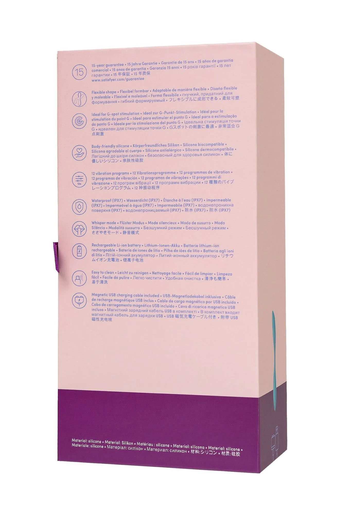 Чтобы продлить срок службы Satisfyer G Spot Flex 1 и сохранить материал в идеальном состоянии, используйте смазки на водной основе. После каждого применения промывайте игрушку теплой водой с мягким антибактериальным средством для интимных товаров. Заряжается устройство через магнитный USB-кабель — один цикл займет около 2 часов, далее вас ждет до 60 минут удовольствия в автономном режиме.