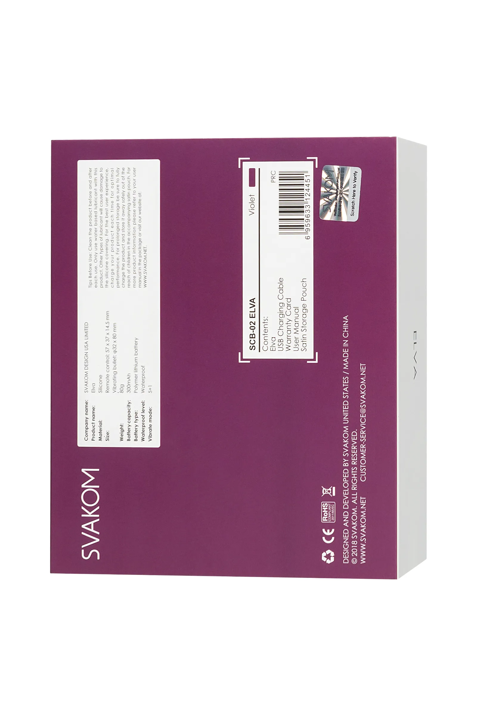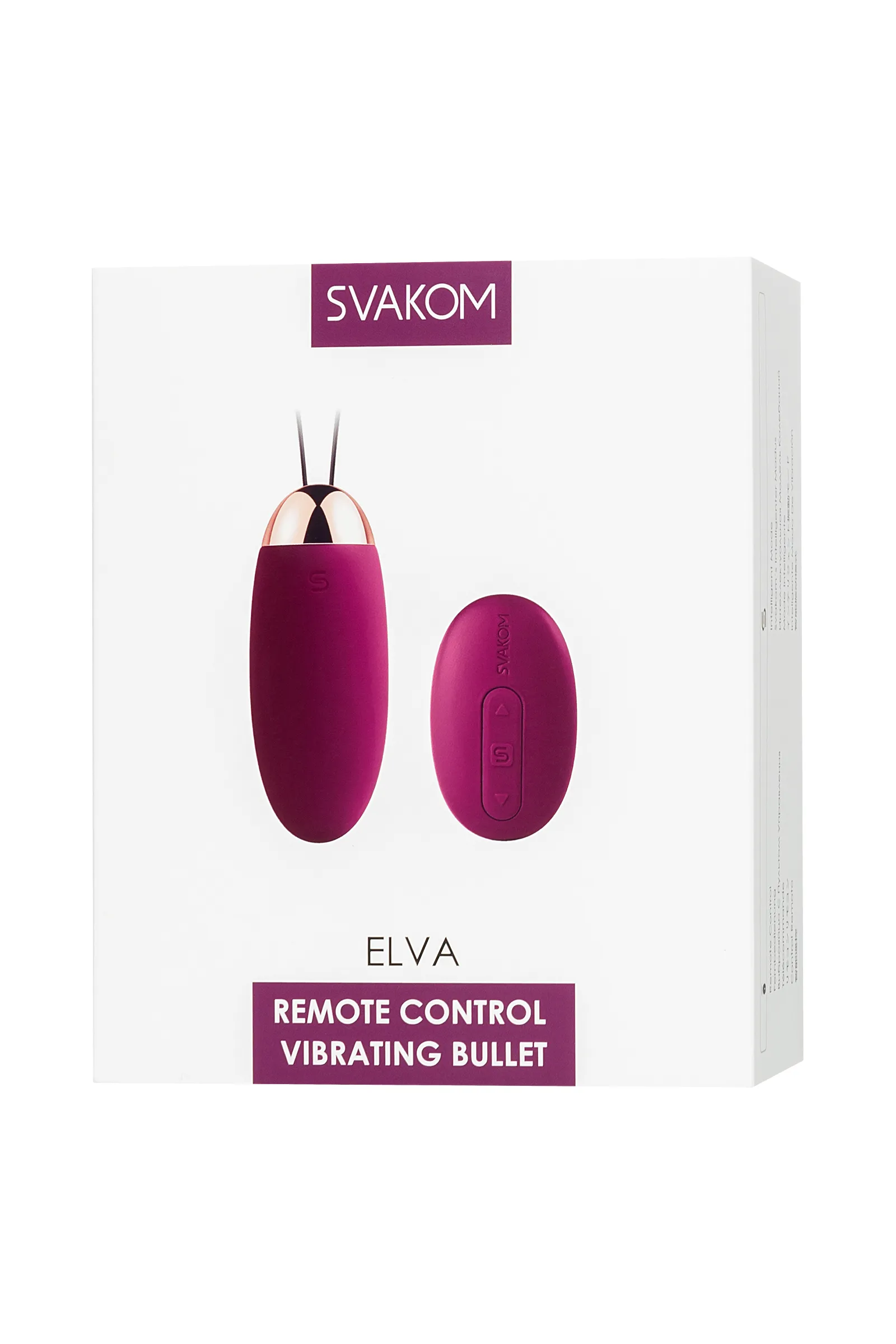 Svakom Elva — это виброяйцо может использоваться с пультом дистанционного управления и без него. Работа изделия с помощью пульта дистанционного управления - это наиболее удобный способ использования, так как все кнопки под рукой. В таком случае эта игрушка может быть использована и для парного взаимодействия. Svakom использует только высококачественные моторы, которые поставляются от лучших производителей, они мощные, тихие и имеют длительный срок службы. Уровень шума не превышает 50 дБ, вы можете едва услышать что-либо с расстояния 1 метр. Elva имеет интеллектуальный режим SVAKOM, который имитирует частоту вибрации во всем процессе секса от прелюдии и до оргазма. Один раз нажав кнопку "s", вы совершите увлекательнейшее секс-путешествие. От робкой прелюдии, сексуальной дразнящей ласки, сильного пульсирующего возбуждения, игра может растянуться на несколько оргазмов, это феерический секс-опыт, который Вы захотите повторить. Играть с Elva можно в душе, она выдерживает мощные струи воды. Время зарядки – 1,5 часа, время работы – 2,5 часа. Elva имеет 5 различных режимов, и 5 интенсивности в каждом режиме, поэтому у вас есть 5 х 5 = 25 + 1(интеллектуальных режимов)=26 вариаций виброрежимов. У Elva современная и экологически безопасная упаковка. При покупке вы получаете изящный конверт и прочную коробку, сам продукт и мешочек для хранения, зарядное устройство, руководство пользователя, инструкции по уходу и описание сертификатов и гарантийная карта
